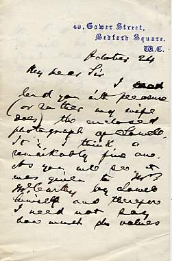 Autograph Letter Signed to M[oncure] D[aniel] Conway (1832-1907, American author), 1½ pages 12mo, 48 Gower Street, Bedford Square, 24 October no year. Sending a photograph of [James Russell] Lowell (no longer present). Small tear in second leaf affecting one word. £55 [No: 22376] The image shows the first page only. |