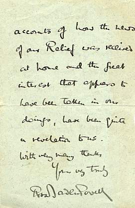 BADEN-POWELL, Sir Robert, 1st Baron (1857-1941). Founder of the Boy Scout movement. Autograph Letter Signed to Mrs Stewart in Edinburgh, 2 pages 8vo on a folded sheet with address and postal cancellations on the reverse (torn in the centre), 25 June 1900. Writing from Rustenburg, which Baden-Powell and his men had captured on 14 June, expressing astonishment at the way in which news of the relief of Mafeking (17 May) had been received at home. '... I can't tell you how welcome your budget of newspapers has been to all of us. We are much out of the way of news here, and the accounts of how the news of our Relief was received at home and the great interest that appears to have been taken in our doings, have been quite a revelation to us.'The address-panel is also franked by Baden-Powell: 'Free on service /R Baden-Powell /M.General' [No: 22518] The image links to a larger or more detailed version. |