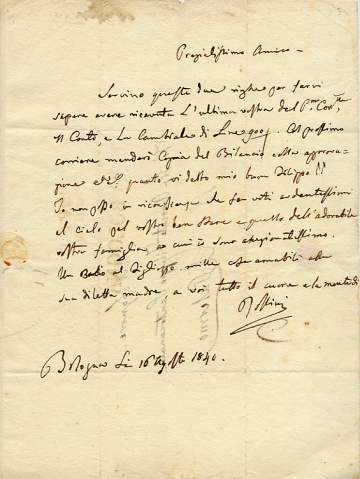 ROSSINI, Gioachino (1792-1868). Composer. Autograph Letter Signed to his lawyer Filippo Santocanale in Palermo, 1 page 4to with address-leaf, Bologna, 16 August 1840. An affectionate business letter. Informing his lawyer that he had received his letter, the bill, and the promissory note of 900 lire. By the next post he intends to send: '... a copy of the balance-sheet, with the approval etc. etc. How much I owe to you, my dear Filippo!! In my gratitude I can do no more than pray ardently for your good health and that of your adorable family, which I hold in great affection. A kiss to your son, very best regards to his delightful mother, and all my heart and soul to you. ...' [No: 22972] The image links to a larger or more detailed version.