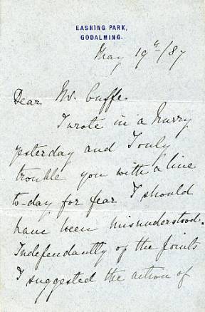 Autograph Letter Signed ('Penzance') to the Hon. H[amilton] Cuffe (1848-1934, lawyer), 4 pages 8vo, Eashing Park, Godalming, 19 May 1887. Attempting to clear up any misunderstanding arising from his previous letter on the subject of modes of punishment. £45 [No: 24515] The image shows the first page only. |