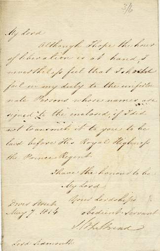 Letter Signed to Lord Sidmouth (Henry Addington, 1757-1844, prime minister 1801-1804), 1 page 8vo with second, endorsed, leaf, Dover Street, 7 May 1814. Sending a petition (no longer enclosed) for the Prince Regent (later George IV). Sidmouth was at this time Home Secretary.