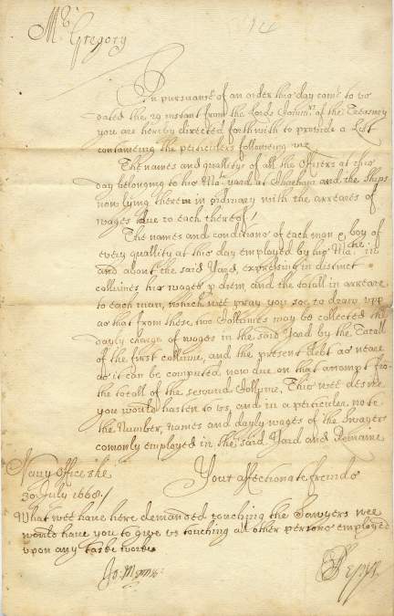PEPYS, Samuel (1633-1703). Diarist. Letter Signed ('S Pepys') to Edward Gregory, Clerk of the Cheque at Chatham, 1 page folio, Navy Office, 30 July 1668. Asking for details of the officers and men of the ships at Chatham so that their arrears of salary could be computed. Signed also by Sir John Mennes (1599-1671). '... In pursuance of an order this day come to us dated the 29 instant from the Lords Comm[issione]rs of the Treasury you are hereby directed forthwith to provide a List containing the perticulers following vizThe letter continues with explicit instructions on putting the data into two separate columns. [No: 25009] The image links to a larger or more detailed version.