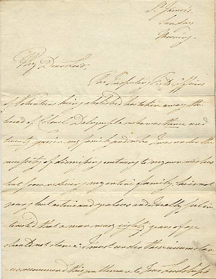 WILLIAM IV (1765-1837). King of the United Kingdom of Great Britain and Ireland. Autograph Letter Signed ('William R', as king, i.e. 1830-1837), 1½ pages 4to with leaf bearing a contemporary endorsement, 'Sunday Morning', no date. Recommending to Lord Liverpool's attention the case of Colonel Dalrymple, who had served him for twenty-three years, and whom the duke had been obliged to dismiss 'contrary to my wishes, but from reducing my entire family'. The endorsement suggests that the letter is indeed written to Lord Liverpool [Charles Cecil Cope Jenkinson (1784-1851), third earl; son of Liverpool the prime minister]. [No: 25295] The image is of the first page. The image links to a larger or more detailed version.