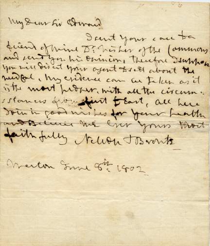 NELSON, Horatio, Viscount (1758-1805). Vice-admiral. Autograph Letter Signed (with the left hand, 'Nelson & Bronte') to captain Sir Edward [Berry], 1 page 4to (old repair to split in centre fold), Merton, 8 June 1802. Concerning a case relating, not unusually, to prize money. 'I sent your case to a friend of mine Dr: Fisher of the Commons and send you his opinion, therefore I suppose you will direct your agent to sett about the needful. My evidence can be taken as it is the most proper, with all the circumstances from first to last, all here join in good wishes for your health. ...'Sir Edward Berry is believed to have been the only naval officer of the time except Collingwood who had by the end of his career won three medals, having served in three general actions, namely the Nile, Trafalgar and San Domingo. The present letter is printed (with the usual 'corrections' to the punctuation) by Sir Nicholas Harris Nicolas (Dispatches and Letters, vol. V, page 15), from a copy in the Nelson Papers. It was written during a comparatively long period of rest for Nelson, who was in residence at Merton Place with Emma Hamilton and her husband, Sir William. He was appointed commander-in-chief of the Mediterranean Fleet on 14 May the following year, two days before war was declared on France. [No: 25490] The image links to a larger or more detailed version.