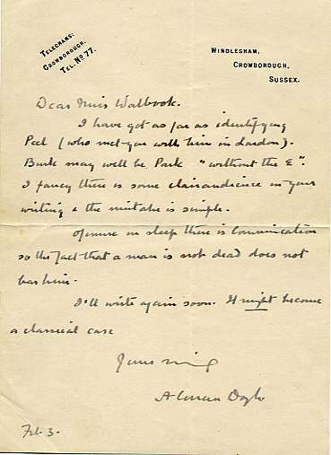 DOYLE, Sir Arthur Conan (1859-1930). Creator of Sherlock Holmes. Series of Three Autograph Letters Signed to Lilian Walbrook, 3 pages small 4to, January and February [1923], with a further secretarial letter, 2 December 1922. To the author of 'The Case of Lester Coltman', 1924, for which Conan Doyle supplied a lengthy introduction. Lilian Walbrook, the aunt of Lester Coltman, had evidently offered to send Doyle the script of her book. In December he replied, rather curtly via a secretary, that he would read it if typed 'but not otherwise'. The 'Case' is a series of letters and communications received by Lilian through 'automatic writing'. Lester Coltman, evidently an accomplished and scholarly young man, educated in South Africa and with a leaning towards a career in scientific work, had joined up as an officer in the Guards and had been killed at Cambrai in December 1917. His subsequent correspondence with his aunt Lilian, her sister Norah and his grandmother, form the bulk of her book. In his first letter to Lilian (signed 'ACD' - the others 'A Conan Doyle') he asks for further details, if possible, about Coltman's death. '... I am very busy. Is there any way that you can suggest of verifying the details of Lieut C's death? How much did you normally know [i.e. not by spirit communication]of the names of his comrades etc. If you have the number of his battalion I could try & inquire. It is of great importance.' It is evident from his introduction to the book that Doyle took this research seriously and was anxious to be sure that there was no trickery or prior knowledge involved in the spirit communications. This is also clear from the second and third letters (both written on 3 February): 'Could we say that the S African Clairvoyants [sic] message was independent of yours, or did yours come after reading hers. It is rather an important point.' He adds also, presumably a propos of the mysterious Burke, that 'in sleep there is Communication so the fact that a man is not dead does not bar him', and concludes that 'It might become a classic case'. In his introduction Doyle says that after reading the script he 'begged Miss Walbrook to get some lighter material by asking her nephew questions upon all those points of actual experience in the other world which interest us all so deeply ... his very full and fresh replies to the queries form the first part of this volume', and he concludes by saying that 'I should regard the objective evidence as good, but not absolutely convincing.' Also included is Lilian Walbrook's copy of The Case of Lester Coltman, 1924, with her own and other family signatures, several crossed through, rather worn and foxed throughout, covers loose; and two photographs of Lester, one from 1909 signed by him on the mount (a little worn at the edges) and another as a young army officer, with two further photographs. [No: 25704] The first image is of one letter only. The image links to a larger or more detailed version.