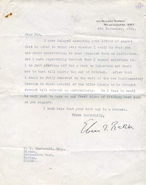 Typewritten Letter Signed to N.P. Macdonald, 1 page 4to (rust mark in corner), 50 Romney Street, 6 September 1934. Declining to contribute to Macdonald's book on patriotism, though wishing it well. '... I am just starting off for a visit to Palestine ... After that I shall be fully immersed in the work of the new Parliamentary Session in which several of the Bills likely to be brought forward will concern me particulaly. ...' Rathbone's visit to Palestine had a profound effect on her. She was deeply impressed with the equal role of women and the Jewish settlers' educational and social institutions. £45 [No: 25734] |