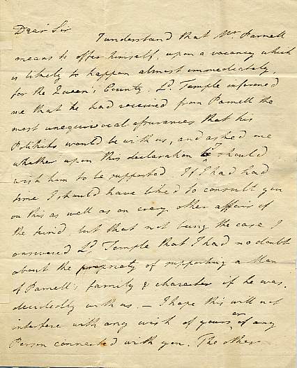 Autograph Letter Signed to the Rt. Hon. William B. Ponsonby at Cheltenham, 2 pages 4to with address-leaf with seal and postal cancellations, St Anne's Hill, 30 September [1805]. Discussing the candidacy of Parnell (Sir John Parnell, 1774-1801) for Queen's County, and declaring that as he had no time in which to obtain Ponsonby's opinion he had given his consent. '... Ld Temple informed me that he had received from Parnell the most unequivocal assurances that his Politicks would be with us, and asked me whether upon this declaration I should wish him to be supported. ... I answered Ld Temple that I had no doubt about the propriety of supporting a Man of Parnell's family & character if he was decidedly with us. ... Pray let me know that I have not been doing mischief. ...'William Brabazon Ponsonby, first Baron Ponsonby (1744-1806) was an Irish politician and sportsman who aligned himself firmly with the Foxite Whigs. Henry Brooke Parnell, first Baron Congleton (1776-1842, politician) had succeeded to the family estates in Queen's county in 1801 on the death of his father, Sir John Parnell (1745-1801). He represented the constituency in parliament in 1802 and from 1806 to 1832 continuously. £450 [No: 25888] |