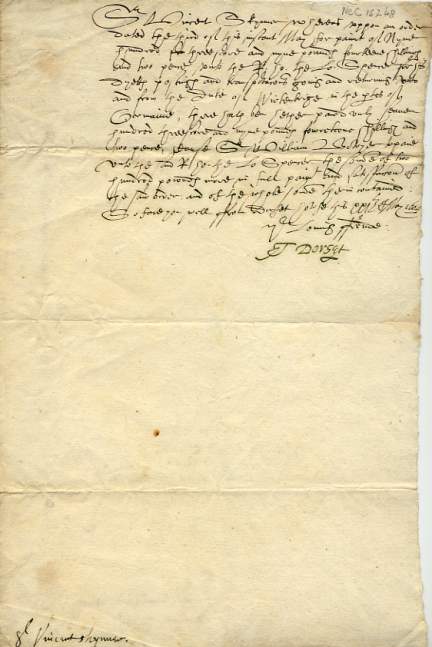 SACKVILLE, Thomas, 1st earl of Dorset (?1536-1608). Poet and administrator. Letter Signed ('T Dorset'), ½-page folio with the recipient's name ('Sr Vincent Skinner') at the foot, Dorset House, 21 May 1604. Authorising a further payment of two hundred pounds to Lord Spencer to bring to a total of 'Nyne hundred three score and nyne pounds fourteene shillings and two pence' the amount he will have received to defray his expenses. 'Sr Vincent Skynner whereas uppon an order dated the third of this instant May for paim[en]t of Nyne hundred three score and nyne poundes fourtene shillings and two pence unto the R[ight] h[onourable] the Lo[rd] Spencer for his dyetts posting and transportacons going and returning unto and from the duke of Wirtenbridge in the p[ar]tes of Germaine, there hath ben hether paed only seaven hundred threescore and nyne poundes foureteen shillings and two pence, cause Sir William Bowyer to paie unto the said R ho. the Lo Spencer the some of two hundred poundes more in full paim[en]t and satisfaccon of the said order: and of the whole some therin contained. So fare you well ffrom Dorset house this xxith of May 1604. Yr loving ffrende / T Dorset'' Lord Spencer (Sir Robert Spencer, 1570-1627, described by Oxford DNBas 'politician and sheep farmer' was created Baron Spencer of Wormleighton in 1603) and was at this time reputed to be the richest man in England. He had been sent to Germany as an ambassador to invest the dukme of Württemberg with the Order of the Garter (although, according to ODNB 'nothing came of this'. With a conjoint second leaf bearing early and contemporary endorsements. Pencilled number at the head. [No: 26208] The image links to a larger or more detailed version.