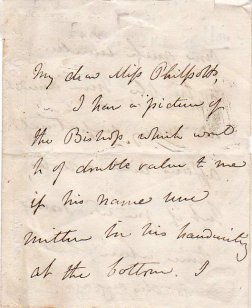 Autograph Letter Signed to Miss Philpotts, 4 pages 16mo (traces of former mounting), Plymouth, 18 February no year. Asking if a portrait she has of 'the Bishop' could be put before him 'when he is disengaged' so that he might add his signature at the foot. '...It wd be a precious memorial to me of one whom I have always venerated & admired beyond words. ...' £45 [No: 26344] The image shows the first page only. |