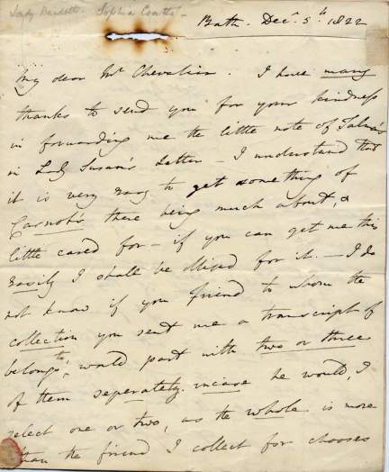 Autograph Letter Signed from Sophia Coutts (1775-1844) to the Parisian bookseller, Chevalier, 3 pages 4to with address (seal tear and small burn hole), Bath, 5 December 1822. Thanking him for 'the little note of Talma's in Lady Susan's Letter', and asking for more autographs to supply her friend's collection. '... for example La Fayette (sic) / Mde. Genlis, Marechal Ney / Lalande / l'Abbe Sicard / LavoisierAs a postscript she adds the names of 'David / Fourcroy / Cardinal Fesch / Lacipede / Lous Bonaparte / Humboldt'. Susan Coutts, the youngest daughter and coheir of the banker Thomas Coutts, had married the politician Sir Francis Burdett in 1793. Although the marriage had to survive a number of difficulties, not to mention Burdett's affair with Lady Oxford, with whom he probably fathered two children, it produced six children, one of whom was the philanthropist Angela Georgina Burdett-Coutts. £75 [No: 26362] The image is of the first page only. |