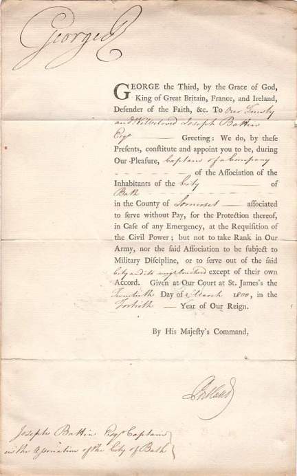 GEORGE III (1738-1820). King of the United kingdom of Great Britain and Ireland. Document Signed, countersigned by the Duke of Portland (1738-1809, Prime Minister), 1 page folio with blank leaf on paper, given at St James's, 20 August 1800. Appointing Joseph Battin to be 'Captain of a Company of the Association of the Inhabitants of the City of Bath'. '... to serve without Pay, for the Protection thereof, in Case of any Emergency, at the requisition of the Civil Power; but not to take Rank in Our Army, nor the said Association to be subject to Military Discipline, or to serve out of the said City and its neighbourhood except of their own Accord. ...' [No: 26550] The image links to a larger or more detailed version.