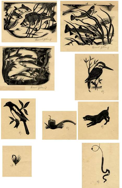 GIBBINGS, Robert John (1889-1958). Wood-engraver, author and book designer. Autograph Letter Signed and 3 Typewritten Letters Signed to Herbert Palmer (1880-1961, poet and literary critic), 6 pages 4to on paper of the Golden Cockerel Press, April-August 1933. Together with nine wood-cut proofs for Palmer's The Roving Angler (1933), three signed in full and six with initials. All are on fine wove paper with wide margins. The letters discuss Gibbings's work on the illustrations to Palmer's book, a collection of essays, which was published by Dent in 1933, explaining in the first letter that he is planning to do the frontispiece, the chapter headings and other small '"notes" to decorate the title page & any odd blanks'. Other letters discuss technical details and the difficulty of making alterations etc. '... The trouble in a case of this kind is always the same that the artist thinks more of the picture than of the ingredients thereof. If I put in all the scales on the grayling it would alter the general pattern of the black and white. With all these engravings the blocks are now finished and once the thing is cut away it is impossible to put it back without very great trouble ... .' In last letter Gibbins declines to provide a free set of proofs (he had already offered proofs during the consultation process): 'As I have now sold this press and am depending entirely on engraving for my living I cannot very well give away any more but I would let you have a set for the nominal price of 2 guineas ... I have only taken fifteen proofs of each so they may be considered scarce items!!.' The three larger woodcuts (of fish) are about 65 x 86 mm. (c.2½ x 3 inches), and the smaller ones are of birds (two), a dog, angling equipment and a pipe. [No: 26619] The image links to a larger or more detailed version.