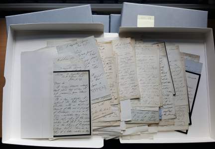 DIBDIN, Henry Edward (1813-1866). Composer. Archive of Dibdin's correspondence covering almost all of his relatively-brief life and career and in particular his twenty-years of marriage. Together with extensive groups of other papers, particularly Dibdin's lifelong correspondence with Edward Francis Rimbault. A comprehensive and apparently untapped resource for the life of a distinguished British musician. Henry Edward Dibdin was born in London, the son of Charles Isaac Mungo Dibdin (1768-1833), known as Charles Dibdin the younger, and was taught music by his sister, the harpist and composer Mary Anne Dibdin (1799-1886). There is a letter from his father to the sister in this archive. Henry also played the viola and the organ (and one assumes the piano). He played the harp at Paganini's last concert at Covent Garden in 1832, and in the following year he moved to Edinburgh, where he resided for the rest of his life. (See Oxford DNB.The major part of the archive is in annual folders from 1842 to the end of Dibdin's life (and thereon in the form of hundreds of letters and other material relating to the extensive Dibdin family. The following is a brief summary of the contents: Henry Edward Dibdin's letters to his wife, née Isabella Perkins Palmer (b.1828, soprano and hymn writer) comprising almost 200 long and detailed letters, written during the whole of their married life, 1844-1866. Included is Isabella's school report of 1842 and the marriage certificate of 26 July 1846. This is the most significant extant resource for a biography of Dibdin. Letters to H.E. Dibdin, many on musical subjects: Edward Francis Rimbault [pseud. Franz Nava] (1816-1876, writer on music and antiquary): c.35 letters, some of considerable length (one of 8 pages 4to), with some musical notation; John Camidge, jnr., Sir George Stuart Mackenzie, John Thomas Surenne (in verse), the Duke of Wellington (1850, declining a dedication, rather worn), Bulkeley Bandinel (Bodleian Library, 1850), David Laing (3), William Henry Havergal, George Farquhar Graham, Baron von Tucher, Charles Oberthür (2), Peter Maurice (3, from New College etc.), William Swan, John Hullah, and others. Several letters written in 1865 include testimonials relating to Dibdin's candidature for the professorship of Music at Edinburgh. Also included are letters of many family members including his brother Robert William Dibdin (1805-1887), and, significantly, his son Edward Rimbault Dibdin (1853-1941 - musician, painter and curator of the Walker Art Gallery): c.11 to his own son, Thomas. Other family letters including c. 20 of Thomas Colman Dibdin, 1886-1889 with letters to him from from A.C. Mackenzie (6, 1889-91), (Sir) Charles Hallé (1888), J.L. Toole (2, 1888), Carl Rosa (1888), and others. Other papers: Over fifty letters from from W[illiam] J[ohn] Lawrence (author of 'Speeding up Shakespeare, 1937, etc.) (1862-1940) to E.R. Dibdin, c.1893-1938. Lengthy letters, to include offprints etc. William Thomas Freemantle of Barbot Hall, Rotherham (1849-1931, bibliographer and book collector): correspondence with E[dward] R[imbault] Dibdin, c.55 letters with related material. Transcripts of Elizabethan songs (Campion etc.) in a folder addressed to the Music Section of the Clarendon Press (watermark 1931). Two brief examples: Edward Francis Rimbault to H.E.D., 4 pages 8vo, London, 9 June 1849: 'It is my intention to reprint old John Day's Psalter, with an Historical Account of the rise & progress of Psalmody. ... The only copy of the original edition with which I am acquainted is in the Library of Brasenose College Oxford. ... I have both editions of Ravenscroft's work, and also the second edition of Este's Psalter. I have also Richard Allison's Collection of Psalm tunes ... If any of these are of the slightest use I shall feel great pleasure in lending them to you. ...' (Dibdin's best-known work, the Standard Psalm Book was published in 1851). B[ulkeley] Bandinel to H.E.D., 3 pages 8vo, Bodleian Library, 18 November 1850: '... I have now before me The Booke of Psalmes Englished both in Verse and Metre by Henry Ainsworth - 8[vo] Amsterdam 1646. I think a short extract from the preface will best enable you to decide whether you would like any part to be copied - (which can very well be done by one of my junior assistants who is a chaplain of New College where is one of our best choirs) ...' [No: 26630] The image links to a larger or more detailed version.