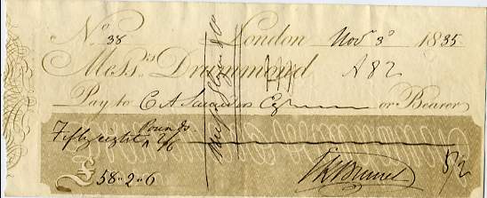 Cheque signed ('I.K. Brunel') and partially complete by him, in favour of C.A. Saunders, for £58 2s. 6d., on Messrs Drummonds, London 3 November 1835. Endorsed in the crossing by Brunel for Messrs Glyn & Co. £350 [No: 26756] |