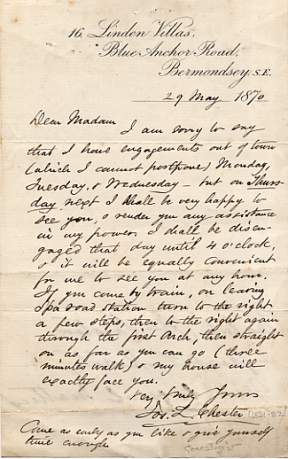 Autograph Letter Signed to an unnamed lady, making arrangements to see her & to 'render you any assistance in my power', 1 p. 8vo, Bermondsey, 29 May 1870. £88 [No: 3673] |